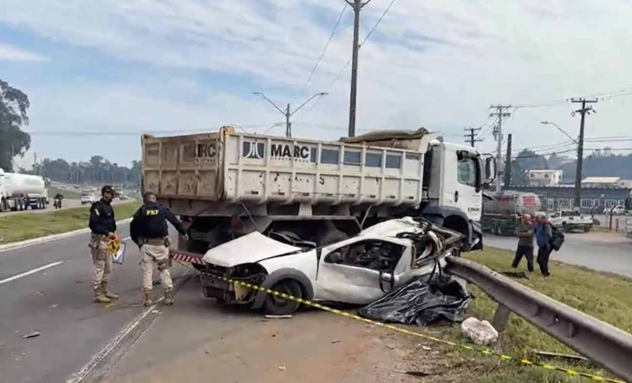 Batida aconteceu no final da manhã desta sexta-feira (7). Veículo que bateu contra outro carro, perdeu o controle, invadiu o canteiro e parou na contramão, onde foi atingido por caminhão. Jovens morrem em batida entre carro e caminhão na rodovia do Xisto Reprodução/RPC Dois jovens morreram em um acidente envolvendo um carro e um caminhão na BR-476, no trecho da Rodovia do Xisto, em Araucária, na Região Metropolitana de Curitiba, na manhã desta sexta-feira (7). De acordo com a Polícia Rodoviária Federal (PRF), as vítimas estavam em um veículo que bateu contra outro carro. Com isso, o motorista perdeu o controle, invadiu o canteiro e parou na contramão, onde foi atingido por um caminhão. Segundo a polícia, as vítimas foram ejetadas do veículo. A polícia isolou o local e uma das faixas precisou ser bloqueada para a remoção dos veículos, por conta disso, o trânsito apresentou lentidão na região. Duas mortes em acidente na Rodovia do Xisto LEIA TAMBÉM: PodParaná: Hotel Bandeirantes foi um dos mais luxuosos do Brasil e é patrimônio estadual Buscas: 'Coração arrebentado', diz pai de homem que estava em avião que desapareceu na Serra do Mar, no Paraná Bancada do Paraná: veja como cada deputado federal votou a PEC da reforma tributária Os vídeos mais assistidos do g1 PR: Veja mais notícias da região no g1 Paraná. Acesse nosso canal no WhatsApp