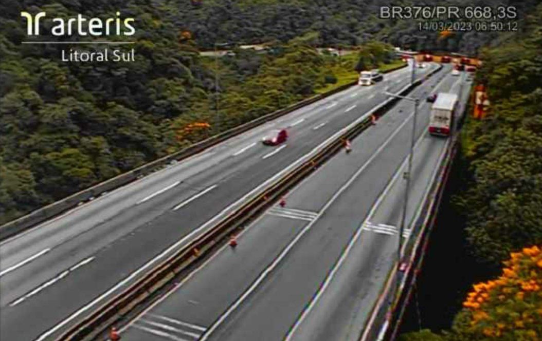 Estrada da Graciosa e BR-376 foram reabertas na noite de segunda (13); BR-277 continua com dois desvios operacionais. BR-376 foi reaberta por volta das 22h de segunda (13) ALS As rodovias que dão acesso ao litoral do Paraná estão liberadas para tráfego na manhã desta terça-feira (14), de acordo com a Polícia Rodoviária Federal (PRF). Na segunda-feira (13), a Estrada da Graciosa e BR-376 estavam interditadas. Veja abaixo como está a situação das estradas. O trecho da BR-376 em Guaratuba, no litoral do Paraná, foi reaberto por volta das 22h de segunda, após ficar interditado por cerca de seis horas, de acordo com a Arteris Litoral Sul, concessionária responsável pelo trecho. A Estrada da Graciosa foi liberada na noite de segunda. A rodovia estava interditada desde a madrugada de domingo (12), após um novo deslizamento de terra. Não é permitido o tráfego de caminhões na estrada. A BR-277 na região de Morretes, também no litoral, está com dois desvios operacionais, segundo a Polícia Rodoviária Federal (PRF). O primeiro, no km 42, após um deslizamento de terra registrado em outubro de 2022 e o segundo, do km 33,9 ao 32,8, após um afundamento do asfalto no dia 7 de fevereiro. Rotas Alternativas Como rotas alternativas para o estado de Santa Catarina, a PRF também indica a BR-116 e a BR-470. Câmeras da concessionária registram chuvas na BR-376 Arteris Litoral Sul Histórico de fechamento na BR-376 O trecho da rodovia foi bloqueado pela primeira vez em 28 de novembro do ano passado, quando uma barreira deslizou e atingiu 16 veículos. Foram 10 dias de interdição até a liberação de duas faixas da BR-376. No fim do ano passado, em 20 de dezembro, o km 669 voltou a ser totalmente fechado para tráfego por conta das chuvas. À época, o acumulado de água passou dos 50 milímetros em 24 horas. Em 19 de janeiro a BR-376 voltou a ser interditado entre Paraná e Santa Catarina após nova queda de barreira. Ninguém ficou ferido. No dia 2 de fevereiro, a rodovia foi bloqueada preventivamente por conta do alto volume de chuva. Estrada da Graciosa já havia sido atingida por deslizamentos Em 14 de fevereiro, um deslizamento atingiu o local por onde o trânsito fluía no sistema pare e siga. Isso porque, no fim de novembro de 2022, a rodovia já havia sido danificada e bloqueada após desmoronamentos. Leia também Problemas na BR-277 no Paraná atrasam escoamento da safra agrícola e exportações Região da interdição na BR-277 enfrenta lentidão há meses Desde o final de 2022, a mesma região onde houve o bloqueio da BR-277 tem tido lentidão no sentido litoral por conta de obras de reparo da estrada, atingida por um grande desmoronamento de pedras há cinco meses. Em fevereiro deste ano, o Departamento de Estradas de Rodagem (DER-PR) disse que a obra na altura do km 41 tinha entrado na fase final. O prazo para conclusão é até o final de março, se o tempo colaborar. Vídeos mais assistidos do g1 PR: Veja mais notícias do estado em g1 Paraná.