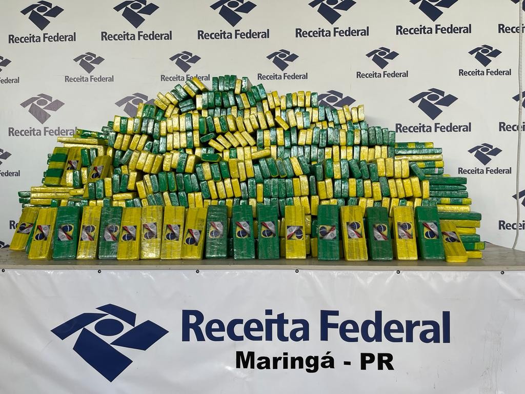De acordo com os fiscais, carga seria levada para São Paulo. Polícia Civil vai investigar o caso. Receita Federal apreende mais de uma tonelada de maconha em Maringá (PR) Reprodução/Receita Federal A Receita Federal apreendeu nesta quinta-feira (16) mais de uma tonelada de maconha em uma transportadora de Maringá, norte do Paraná. Segundo os fiscais, o entorpecente estava escondido em móveis da cozinha do estabelecimento. De acordo com a Receita, a maconha foi embalada em tabletes com as cores verde e amarela com adesivos com as bandeiras do Brasil e Paraguai. O material seria levado para São Paulo (SP). Motorista que atropelou fotógrafo e arrastou moto por quase dois quilômetros é indiciado por homicídio duplamente qualificado, diz polícia Três são presos, e carros de luxo e moto aquática apreendidos em operação contra suspeitos de tráfico de drogas no Paraná Receita Federal apreende mais de uma tonelada de maconha em Maringá (PR) Reprodução/Receita Federal A droga foi levada para a Polícia Civil, que deve investigar quem seriam os responsáveis pelo produto. Conforme a Receita Federal, ninguém foi preso durante a operação. Mais assistidos do g1 PR Veja mais notícias da região em g1 Norte e Noroeste.