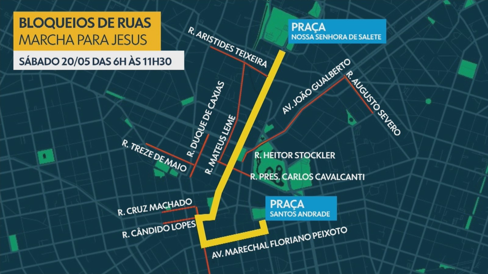 Trânsito será alterado pela manhã entre as praças Santos Andrade e Nossa Senhora de Salete. Marcha Para Jesus é neste sábado em Curitiba Ruas da região central de Curitiba serão bloqueadas na manhã deste sábado (20) por conta Marcha para Jesus 2023. De acordo com os organizadores, os fiéis se deslocam do ponto de concentração, na Praça Santos Andrade, até o local de destino da marcha, na Praça Nossa de Senhora de Salete. A concentração ocorre a partir das 9h. Às 9h50, os fiéis partem em direção ao Centro Cívico. A estimativa da organização é que 100 mil pessoas participem do evento. Veja ruas bloqueadas abaixo. Compartilhe no WhatsApp Compartilhe no Telegram De acordo com a prefeitura, agentes da Superintendência de Trânsito (Setran) orientam os motoristas na região. Ruas bloqueadas no sábado (20) para a Marcha para Jesus Artes/RPC Ruas bloqueadas Cândido Lopes com a Avenida Marechal Floriano Peixoto; Rua Cruz Machado, a partir do cruzamento com a Avenida Marechal Floriano Peixoto; Rua Treze de Maio com a Rua Duque de Caxias; Rua Presidente Carlos Cavalcanti, a partir do cruzamento com Presidente Farias até a Mateus Leme; Praça 19 de Dezembro, no cruzamento com a Rua Heitor Stockler até a Rua Ary Queiroz; Rua Mateus Leme, a partir da Rua Treze de Maio até a Aristides Teixeira; Avenida João Gualberto com a Rua Augusto Severo; Rua Campos Sales com a Rua Mauá; Leia também: Estrada: Caminhão pega fogo após bater em outro e bloqueia totalmente a BR-277, em Morretes, no litoral do Paraná Sertanópolis: Criança de dois anos morre em acidente entre carro e ônibus na PR-323; três pessoas ficaram feridas PodParaná #131: Coluna Prestes marca história do Paraná com passagem de militares pelo oeste do estado VÍDEOS: Mais assistidos do g1 PR Veja mais notícias do estado em g1 Paraná.