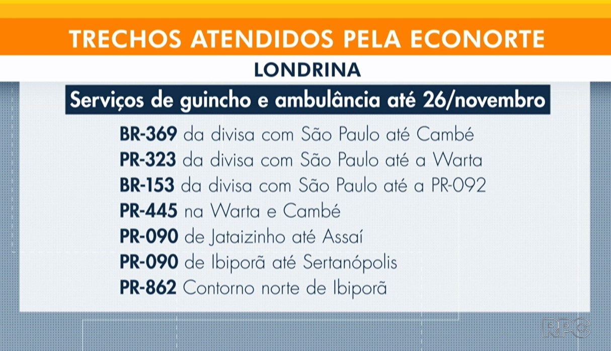 Acordo após fim das concessões era para compensar obra não entregue pela Econorte. Governo disse que terceirizada vai manter serviços e garantiu que eles não terão interrupção. Fim dos serviços de socorro nas rodovias no norte do Paraná Termina neste sábado (26) o acordo entre o Governo do Paraná e a Econorte para prestação de serviços de guincho e de ambulância, além da manutenção do Serviço de Assistência ao Usuário (SAU), em rodovias do Anel de Integração na região norte do estado. O contrato foi fechado após o fim das concessões de pedágios no ano passado como compensação a obras de um viaduto que não foi construído pela ex-concessionária. À época, as atividades em Jacarezinho previam investimento de R$ 14 milhões. Com o fim do contrato, a partir de domingo (27), o Governo do Paraná informou que não haverá renovação e que vai assumir os serviços por meio de uma empresa terceirizada. Garantiu ainda que eles não terão interrupção. Assinatura de novos contratos dos pedágios no Paraná fica para 1º trimestre de 2023, diz ANTT As mudanças atingem mais de 340 quilômetros em trechos da BR-369, BR-323 e BR-153, nas ligações da região e do Norte Pioneiro com o estado de São Paulo, e pontos das PR-445, PR-090 e PR-862. Confira os trechos na imagem abaixo: Serviços de guincho e ambulância de acordo com ex-concessionária na região norte encerram sábado (26) Reprodução/RPC Por nota, o Departamento de Estradas de Rodagem (DER-PR) informou que contratou a prestação de serviços de tráfego rodoviário para atender todas as rodovias estaduais e federais antes contempladas na concessão da Econorte. Disse, ainda, que serão de "guincho mecânico leve e pesado, inspeção de tráfego, veículo de apoio ao Corpo de Bombeiros e veículo boiadeiro para lidar com animais soltos na pista". Usuários devem acioná-los por meio do telefone 0800 400 0404, disponível 24 horas por dia durante todos os dias da semana - incluso fins de semana e feriados. Paraná fica com passagem livre no pedágio Giuliano Gomes/PR PRESS VÍDEOS: Mais assistidos do g1 PR Veja mais notícias da região em g1 Norte e Noroeste.