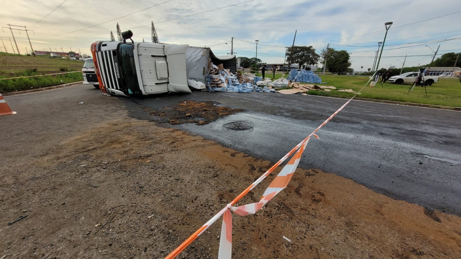 VÍDEO: Carreta carregada com cerveja tomba em Maringá, e PM é acionada para impedir saque de carga