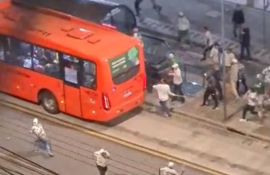 Ação aconteceu na tarde de domingo (2), após o jogo contra o Athlético Paranaense. Torcedores do Palmeiras vandalizam ônibus com passageiros, em Curitiba Imagens que circulam nas redes sociais flagraram torcedores do Palmeiras vandalizando um ônibus do transporte público de Curitiba. A ação aconteceu na tarde de domingo (2), após o jogo contra o Athlético Paranaense. Veja vídeo acima. O grupo atacou o ônibus com pedras, pedaços de madeira e bombas. A confusão aconteceu na Avenida República Argentina, na estação tubo Dom Pedro I. Compartilhe no WhatsApp Compartilhe no Telegram De acordo com o Sindicato das Empresas de Ônibus de Curitiba (Setransp), uma mulher ficou ferida. Torcedores do Palmeiras vandalizam ônibus com passageiros, em Curitiba Redes Sociais O que diz a Setransp Em nota, o Setransp disse que repudia os atos de vandalismo contra veículos do transporte coletivo. O sindicato falou ainda que o vandalismo deixa outras consequências como um ônibus a menos para atender a população. "O Setransp pede que os órgãos de segurança coíbam esse tipo de ato e que os culpados sejam punidos, a fim de que essa prática não se torne corriqueira e, potencialmente, trágica", conclui a nota. O g1 aguarda retorno da Urbanização de Curitiba (Urbs) e da Polícia Civil (PC-PR). Leia também: BR-376: Vídeo mostra caminhão arrastando 14 carros na BR-376 durante engavetamento; seis ficaram feridas Acidente: Caminhão pega fogo após bater contra carro na PR-445, em Irerê; uma pessoa morreu Londrina: Criança e mulher ficam feridas após homem ser morto a tiros em confraternização, em Londrina VÍDEOS: mais assistidos do g1 Paraná Leia mais notícias do estado no g1 Paraná.